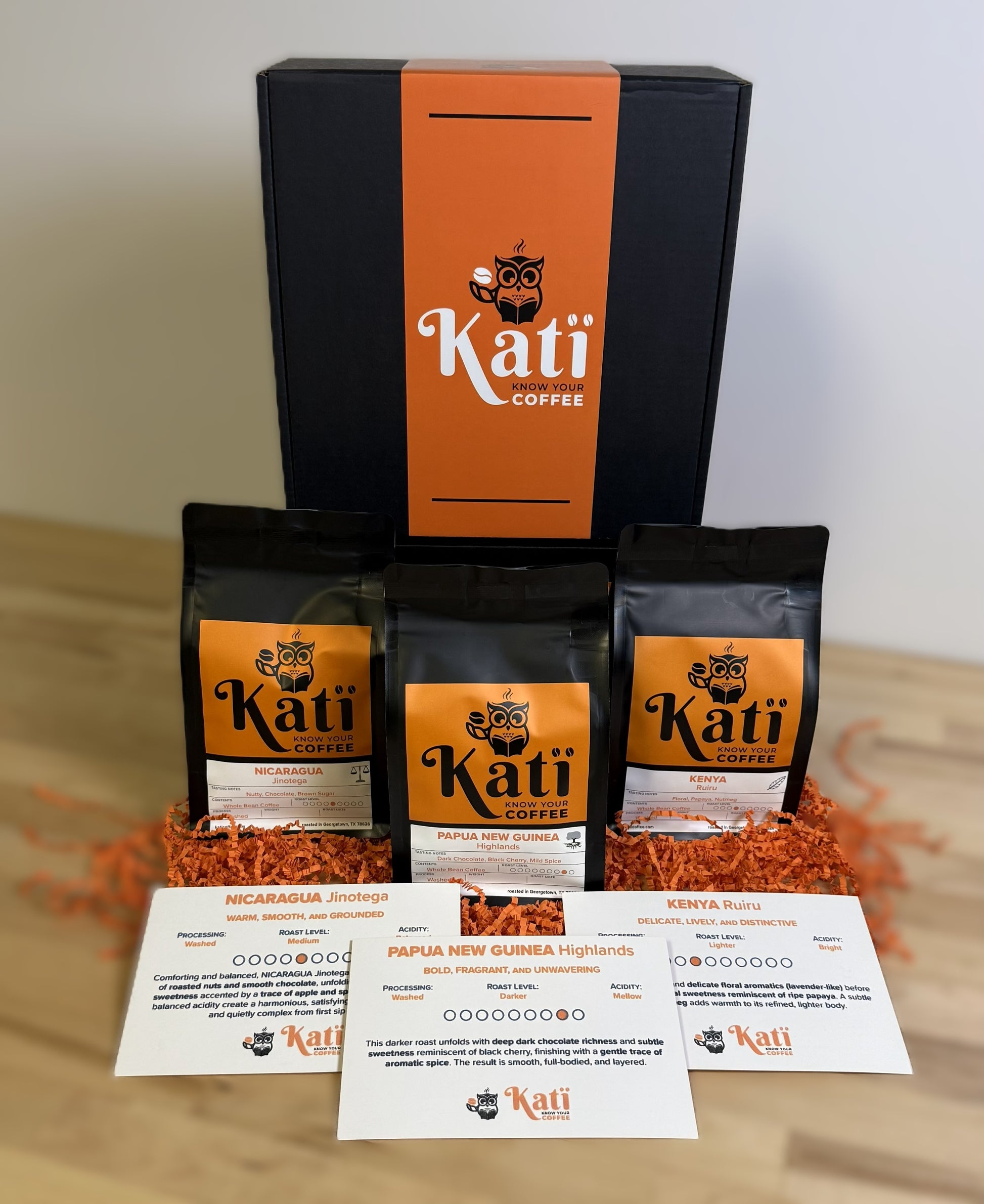The Explorer Set offers a guided tasting experience through three 8 oz coffees: your choice of blends, single origins, or seasonal features. Each coffee comes with a printed tasting card with roast details and flavor notes, turning each cup into a moment of exploration.